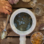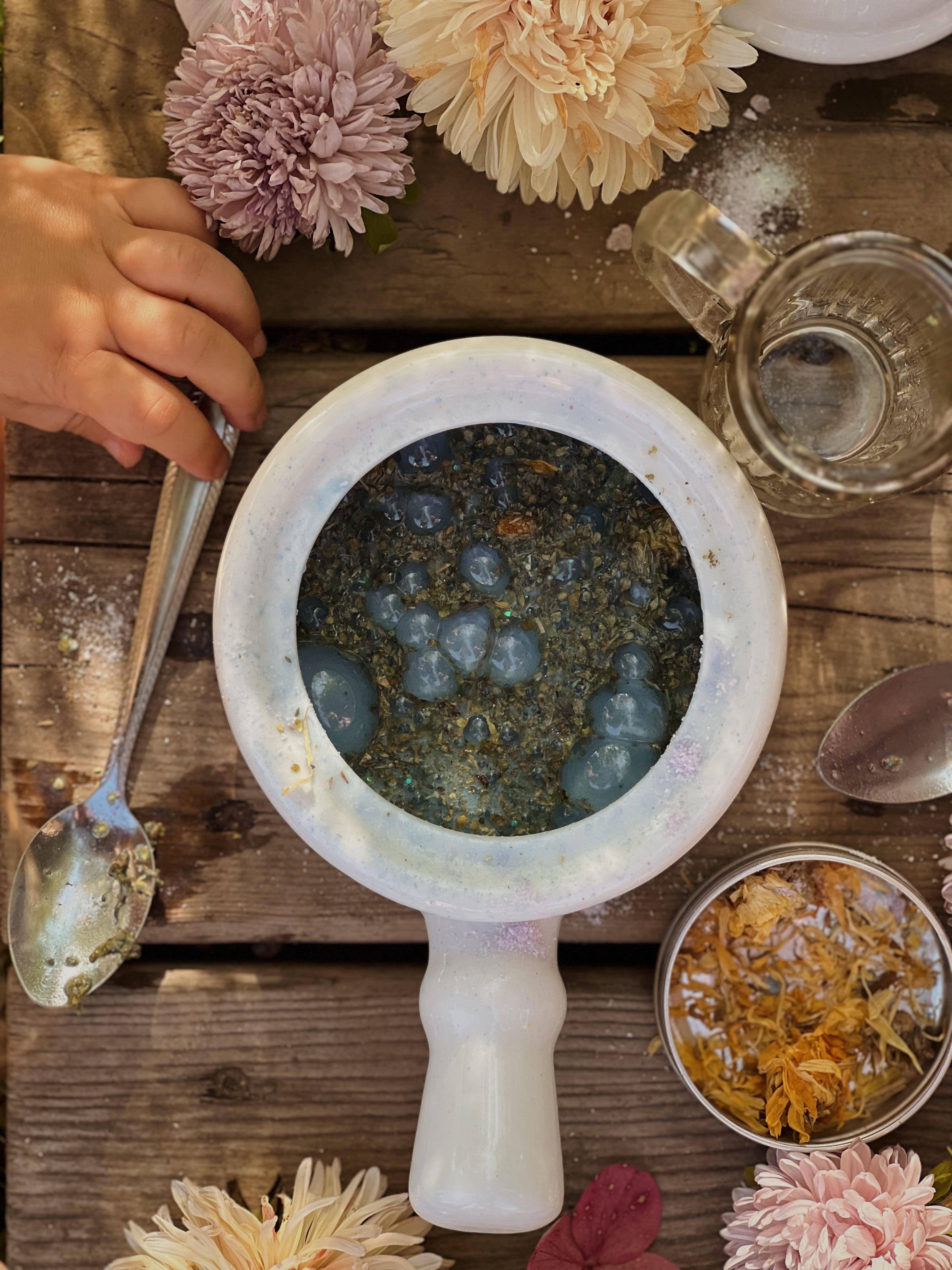 Ingredient List: Baking soda, citric acid, mica powder, biodegradable glitter, pink salt, Epsom salt, dried oregano, sugar, calendula flowers, essential oils.